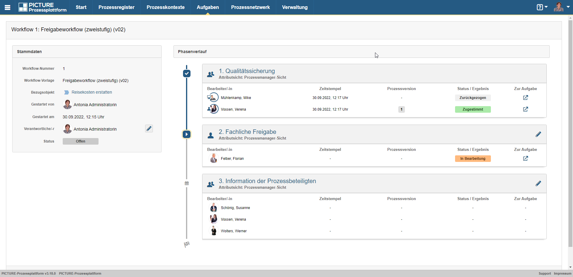So behalten die Prozessverantwortlichen mit der Phasenverlaufsansicht den Überblick über erteilte Zustimmungen und Kenntnisnahmen. Das erleichtert das gemeinsame Arbeiten an Prozessen z.B. in Projektteams enorm und spart wichtige Zeit, welche für andere Aufgaben genutzt werden kann.